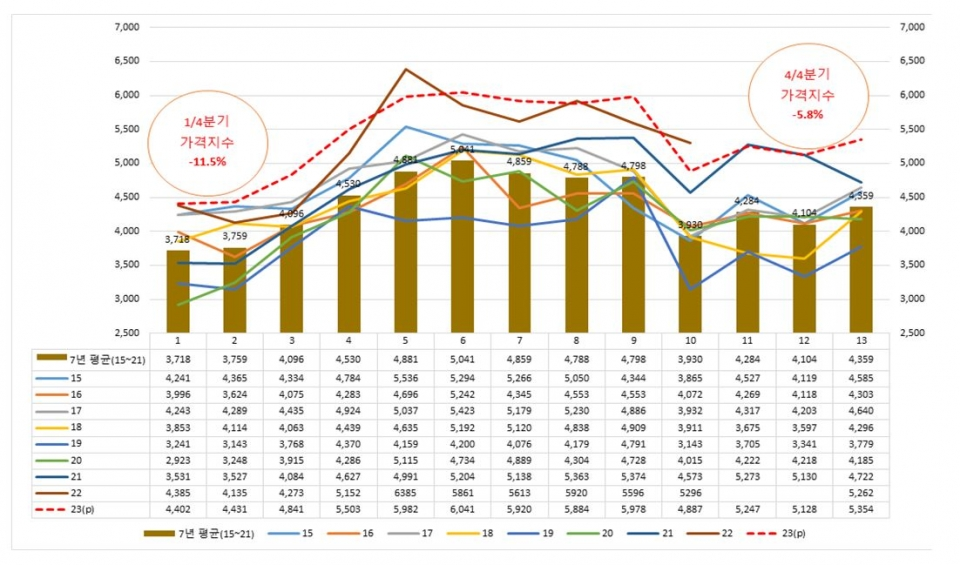 실제로 2015년 이후 1분기 한돈가격은 연중 가장 낮은 수준을 유지하고 있다. 2015년 이후 한돈 평균 가격과 1분기 가격을 비교해보면 △15년=4천311원(연평균 4천585원) △16년=3천900원(〃4천303원) △17년=4천320원(〃4천640원) △18년=4천원(〃4천296원) △19년=3천370원(〃3천779원) △20년=3천358원(〃4천185원) △21년=3천756원(〃4천642원) △22년=4천270원(〃5천300원) 등 형성됐다. 특히 양돈 관련 기관에 따르면 내년 1분기 한돈가격도 현재 생산비(kg당 5천500원 추정) 수준에 크게 못 미치는 4천500원대가 전망되고 있다.