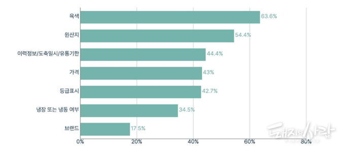 돼지고기 품질을 판단하는 가장 중요한 기준은 ‘육색(63.6%)’과 ‘원산지(54.4%)’‘ 이력 정보·도축일시·유통기한(44.4%)’ 등이라고 답했습니다. 또한 소비자들은 돼지고기 맛은 ‘살코기와 지방의 비율(69.8%)’ ‘부드러운 정도(55.8%)’에 의해 결정된다고 생각하는 것으로 파악되었습니다. 소고기에서 등급 표시가 가장 중요한 품질 판단 기준(78%)인 것과는 대조적입니다.