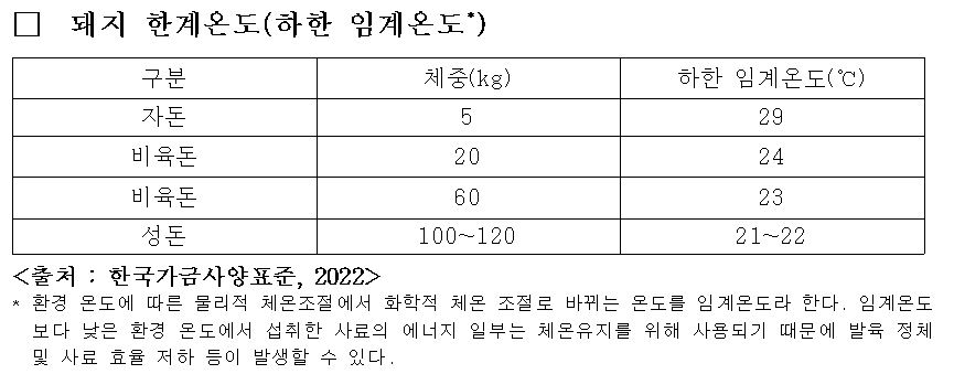 분만사 온도는 20~22도로 유지하고 새끼 돼지 주변 온도는 출생 직후 30도, 1주일 후 27.5도, 젖 뗀 뒤에는 22~25도 정도를 유지한다. 돈사 안 습도를 50~60% 정도로 유지하면 병원균 확산을 억제할 수 있다. 또 겨울철 우려되는 호흡기 질병을 예방하기 위해 저온기 권장 최소 환기량을 참고해 새로운 공기가 공급될 수 있도록 하고 분뇨 처리를 자주 해줘야 한다고 당부했다.