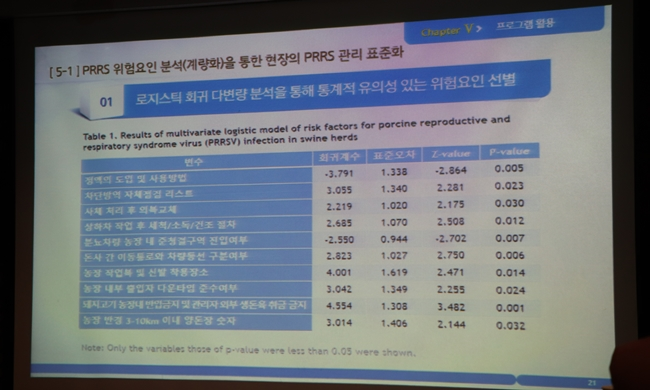 지난해 조사된 137개 농장의 위험도 평가결과를 분석한 박혁 이지팜 연구소장은 “통계적인 유의성이 있는 PRRS 위험요인을 선별하고 있다”며 “이를 방역정책이나 농가 컨설팅에 근거로 활용할 수 있다”고 강조했다.