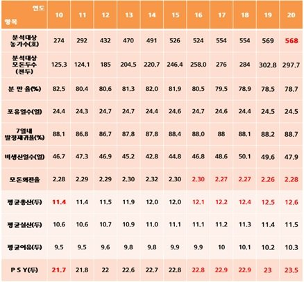 보고서에 따르면 2020년 국내에서 피그플랜을 사용하는 농가는 821개이며 이 중 1년 이상 지속적으로 자료를 입력한 곳은 568개 농가로 집계됐다. 피그플랜 사용 모돈은 29만7673두며 우리나라 모돈의 29.7%에 해당된다. 피그플랜 분석 결과 피그플랜 사용 농가의 2020년 모돈당 연간 이유두수(PSY)는 2010년 21.7두보다 1.8두 증가한 23.5두를 기록했다. 국내 평균으로 통용되는 대한한돈협회의 한돈팜스 사용 농가의 분석 결과인 2020년도 PSY 21.5두에 비해 2두 상회하는 것으로 나타났다.