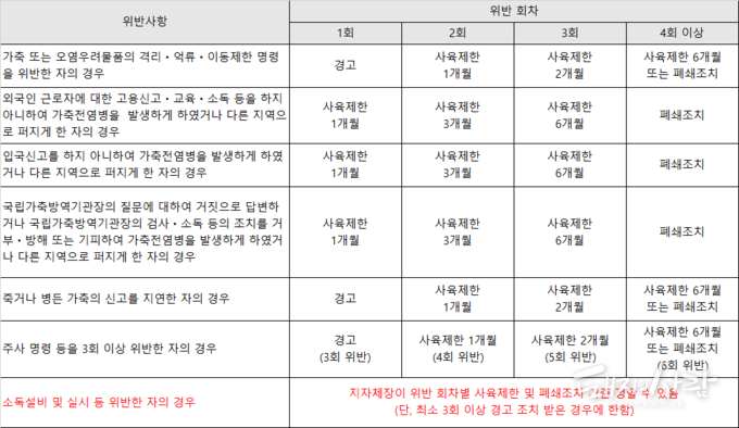 이에 농식품부는 이번 입법예고를 통해 관련 규정을 명확하게 하겠다는 것입니다(시행령 제6조 개정 및 별표 1의2 신설). 법 개정 후 ▶이동제한 명령 위반▶외국인근로자 관리 및 입국 신고 검역 의무 위반 등에 따른 전염병 발생 ▶전염병 신고 지연 ▶구제역 백신 등 접종 미실시 ▶소독시설 및 실시 위반 행위 등에 대해서는 위반 횟수에 따라 사육제한 및 폐쇄 명령을 내릴 수 있습니다.