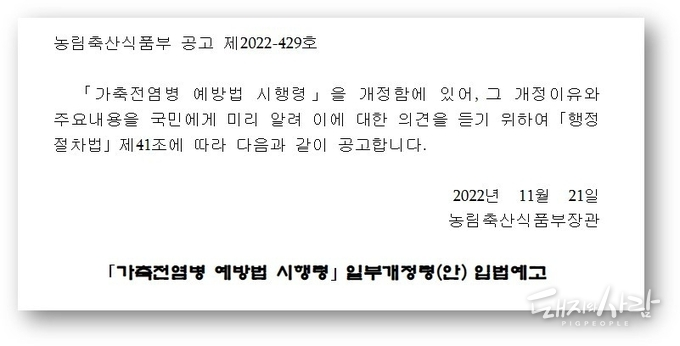 농림축산식품부(장관 정황근 이하 농식품부)는 해당 내용을 담은 가축전염병예방법 시행령 일부 개정안을 21일 입법예고했습니다.