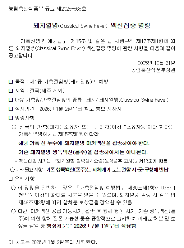 농림축산식품부는 지난 12월 31일 공고를 내고, 2026년 1월 2일부터 제주를 제외한 전국 양돈장을 대상으로 돼지열병 마커백신 접종을 실시한다고 밝혔다.