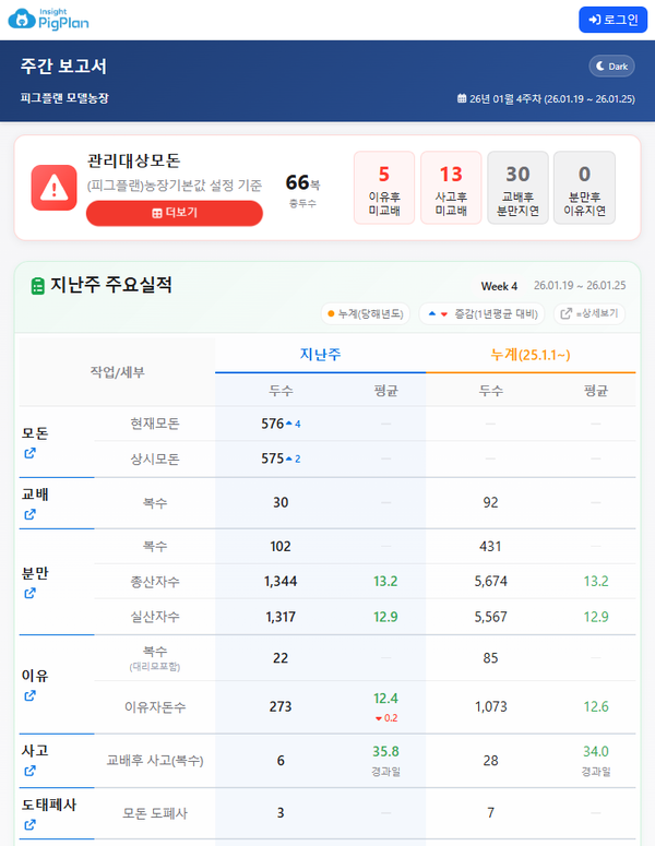 서비스는 매주 월요일 카카오톡 또는 SMS를 통해 농장 대표 및 관리자에게 주간 경영 현황 리포트 링크를 자동으로 발송하는 방식으로 운영된다. 보고서에는 모돈 현황, 교배·분만·이유·출하 등 주요 실적 요약과 금주 작업 예정 일정, 실시간 돈가 정보가 담긴다.