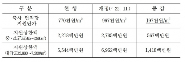이에 정부는 업계와의 논의를 통해 내년도 축사 면적당 지원단가(㎡, 총 공사비 최대 80%)의 경우 돼지는 ㎡당 77만원에서 96만7000원(25.6%↑, 19만7000원)으로 올렸다.